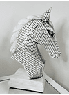 Esta figura de busto de caballo combina un diseño moderno en blanco y negro con patrones geométricos que aportan textura visual y carácter. Ideal para espacios contemporáneos o como pieza focal en una repisa o escritorio, su presencia sofisticada resalta con fuerza decorativa sin perder sutileza.